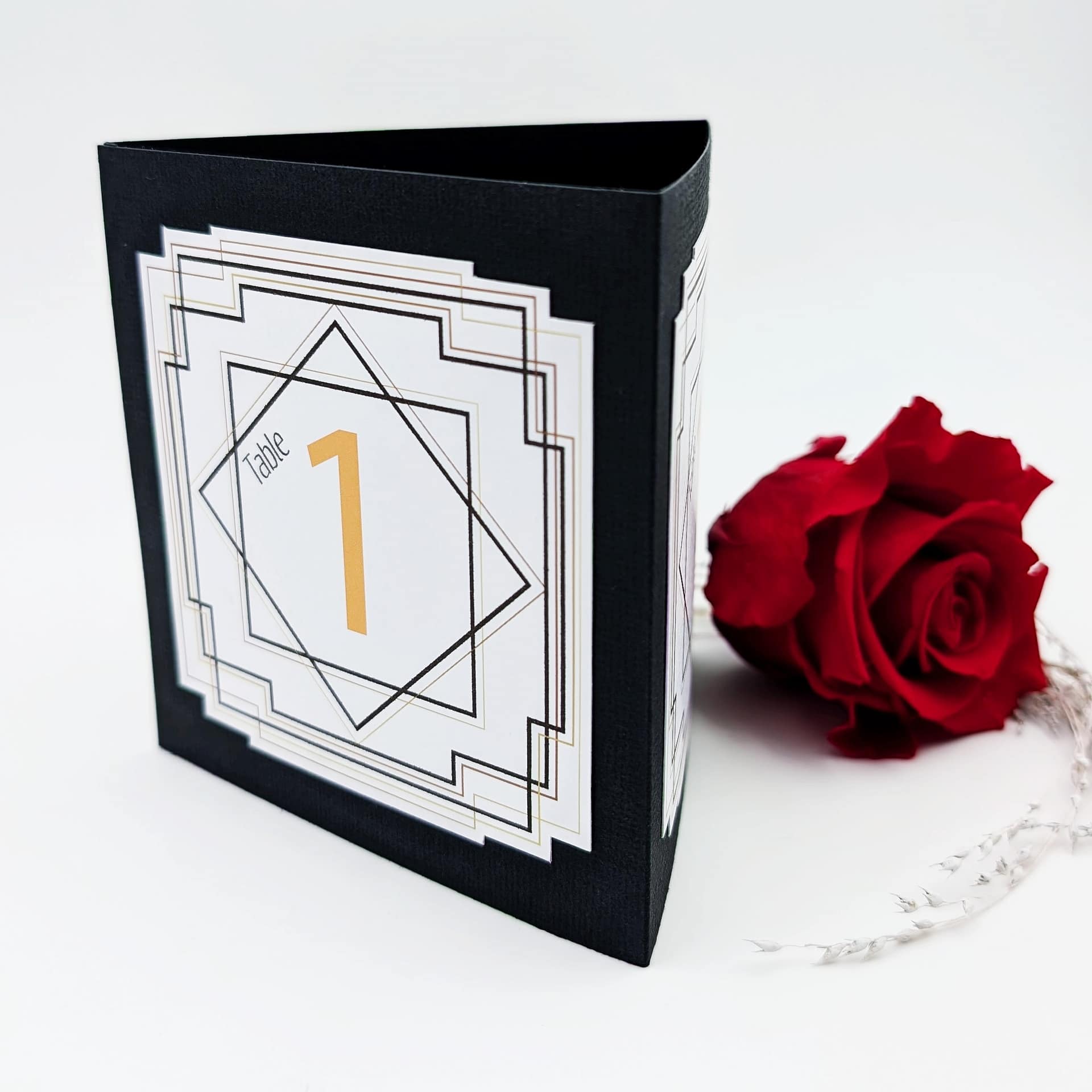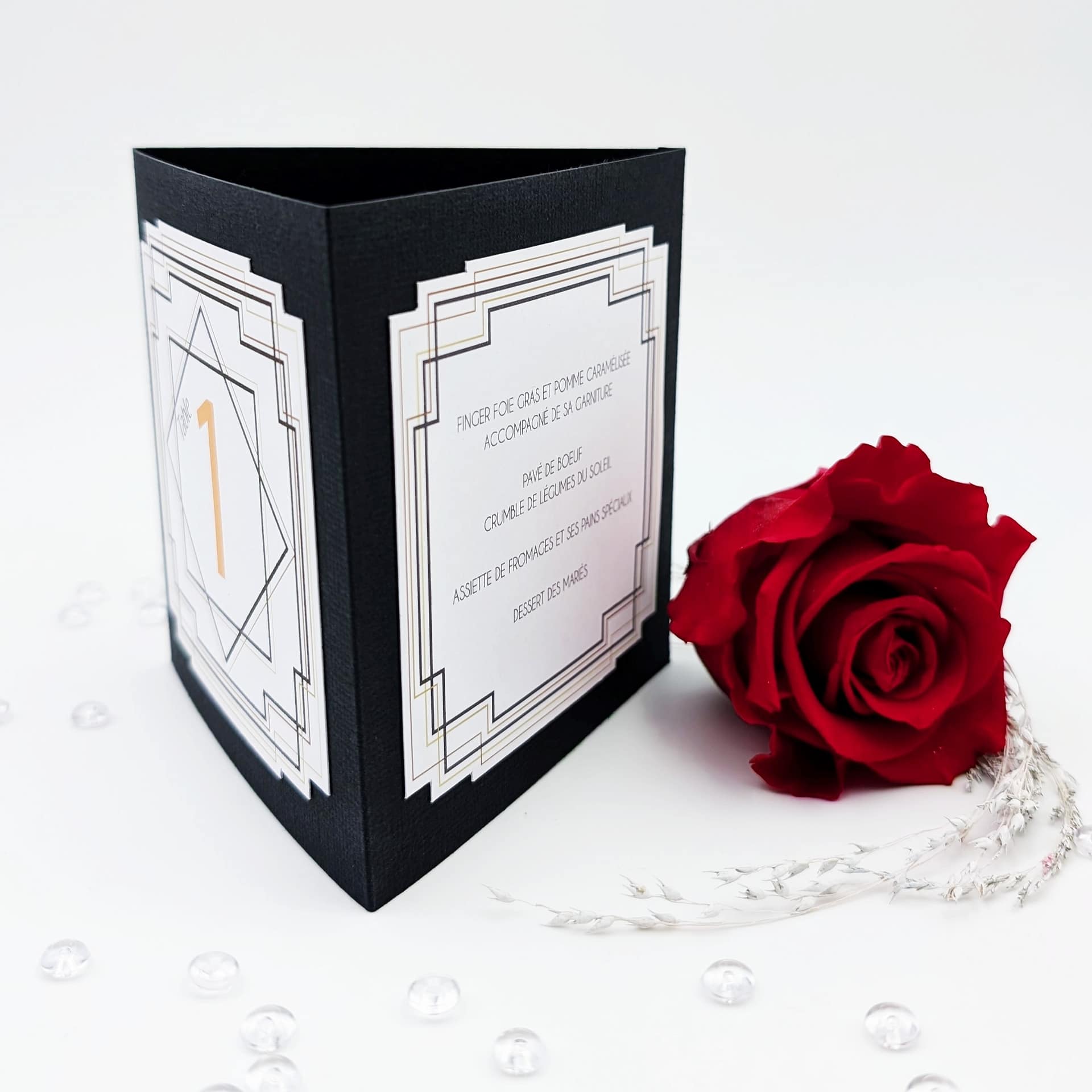 Découvrez ce somptueux numéro de table de mariage Gatsby inspiré par l’ère Art Déco. Ce marque table au style chic et raffiné se distingue par ses découpes originales et ses détails géométriques en or mat et noir, symboles emblématiques des années 1920.